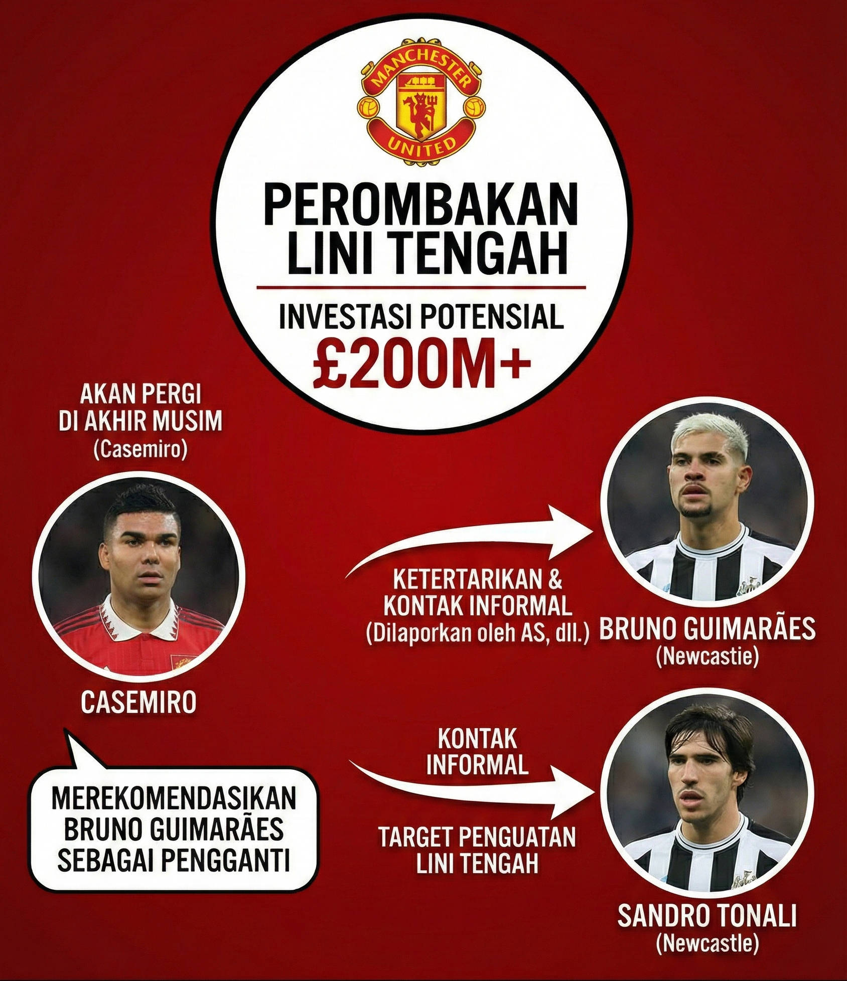 曼联球迷已经讨论了中场双星桑德罗·托纳利和布鲁诺·吉马良斯应该买谁的问题多时,传闻俱乐部密切关注托纳利的未来,而卡塞米罗则推荐巴西同胞吉马良斯充当自己的红魔接班人。