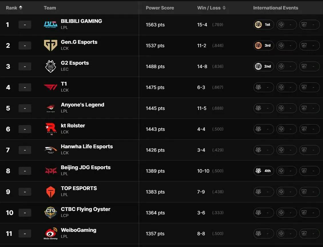 这两天全球战力排行榜也是再度进行了更新,第二赛段开启之后,整个的排名出现了很大的调整。排名第一的依旧是blg战队,作为先锋赛的冠军,他们的分数还是比较高的。第二个是gen战队,第三的是g2战队,前三的排名毋庸置疑,整个的综合状态确实太稳定了。第四个是T1战队,可能也和第二赛段开赛的成绩有一定的关系,和g2战队仅差了13分,估计再赢两局可能就要冲击排行榜的前三名了。第五名是al战队,现在的lpl和lck前五均有两支战队了。